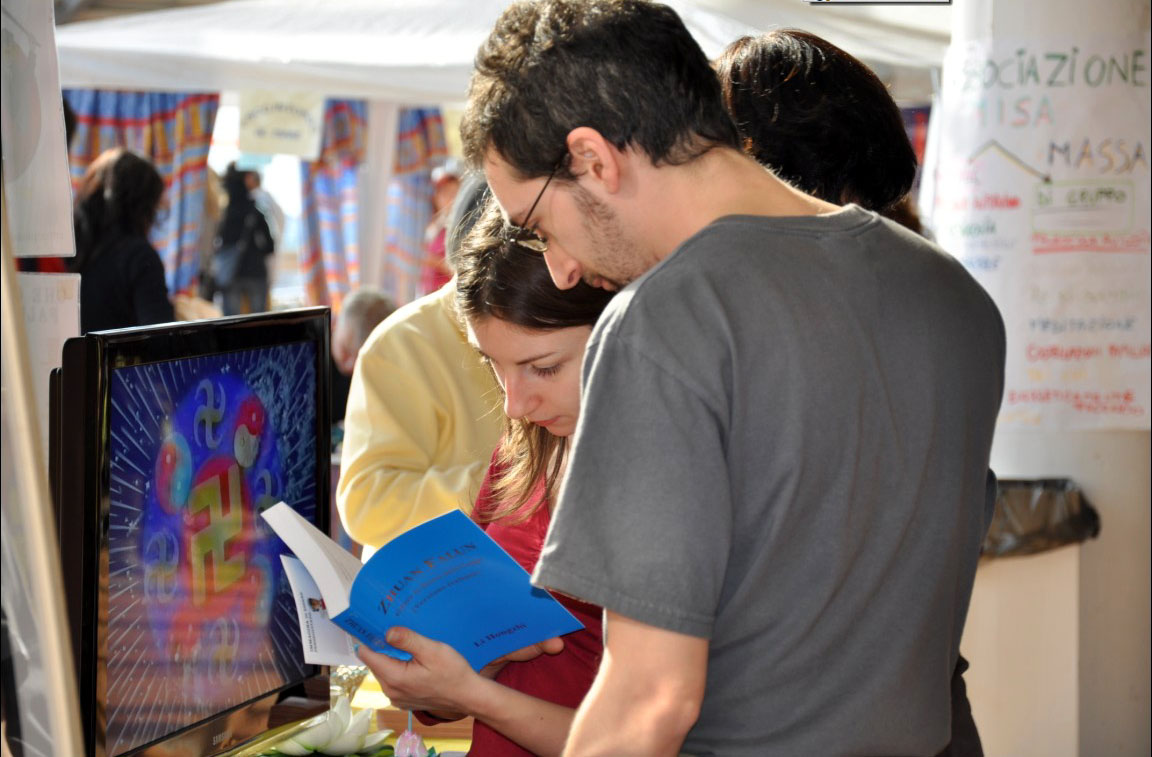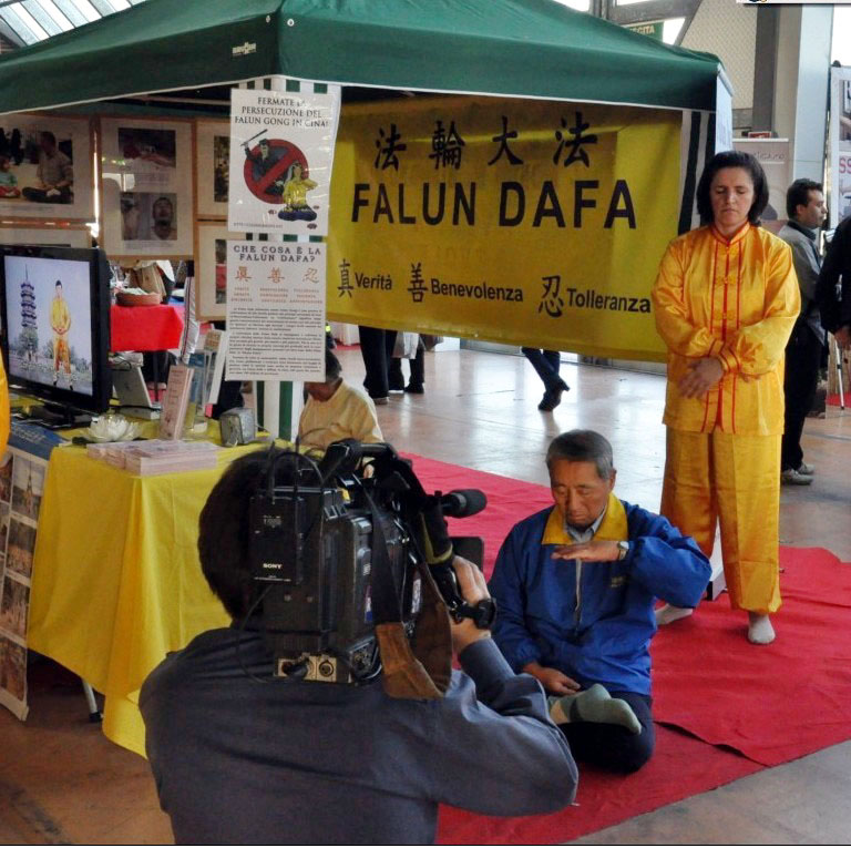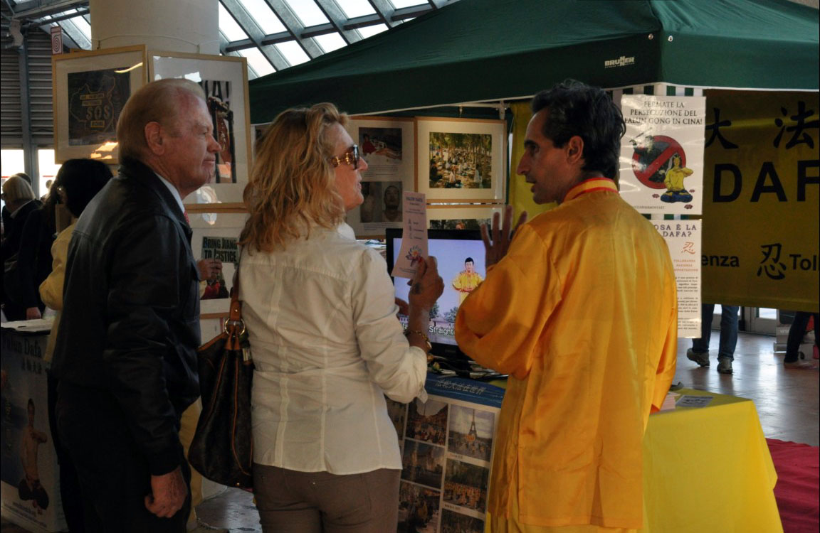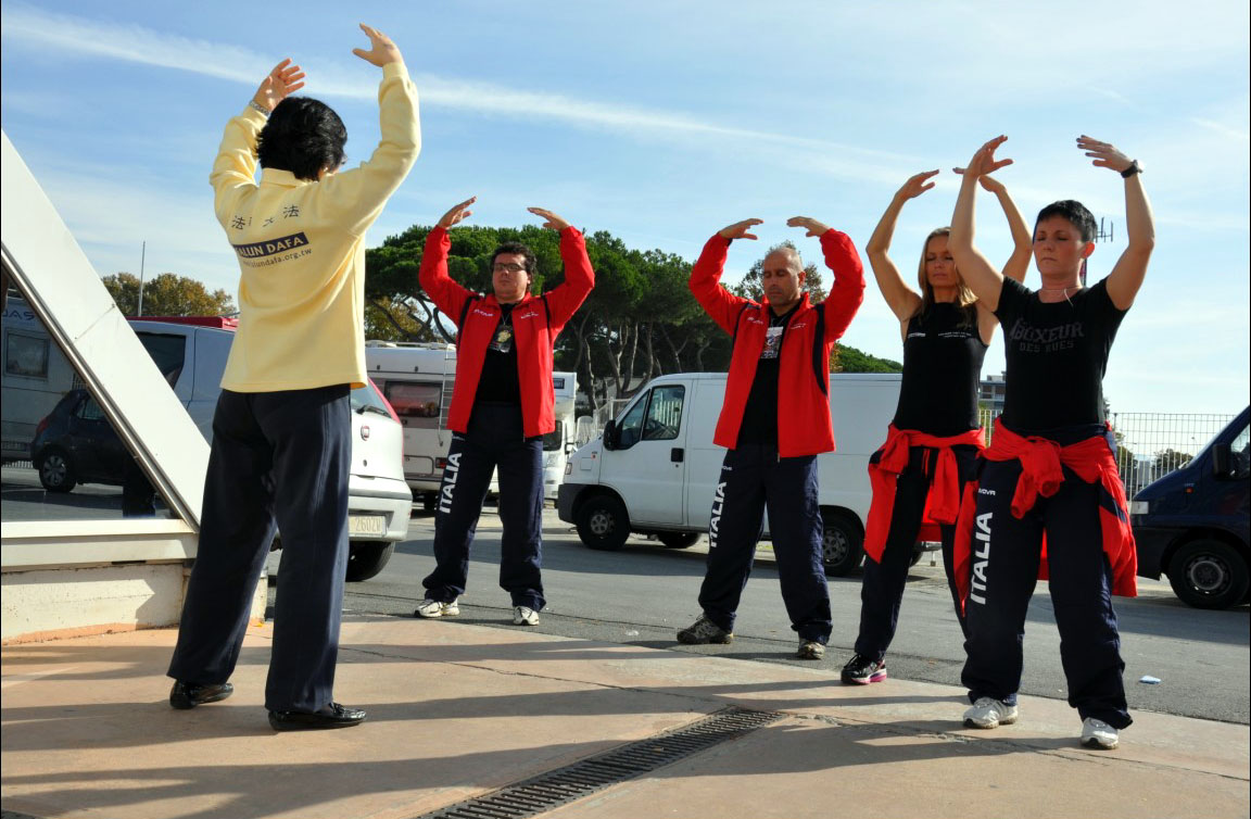 一位来参加武术比赛的意大利年轻人路过法轮大法展位,被学员的功法展示深深吸引,连忙招呼他的同伴一起学习炼功动作。在做叠扣小腹的动作时,他告诉学员:“太神奇啦,我感受到两手被巨大的能量向外推着。”