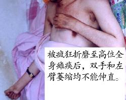 ◆范悦,女,四十岁,医生。范悦因坚持信仰,多次被绑架、非法关押,二零零一年被非法劳教两年。在大连市教养院,范悦被“吊打”酷刑折磨,即把人整个身体呈大字形吊起毒打,用椅子背顶住阴部,用布条把人呈大字形吊起,双腿被用力分开,用木板打阴部、手心及脚心。