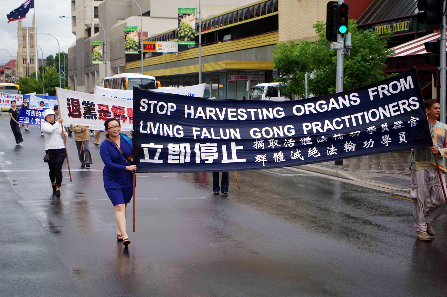 上午十一点,游行开始,“声援一亿五百万勇士退出中共”的横幅在队伍的最前面,而后是墨尔本法轮功学员的腰鼓队,浩浩荡荡地穿越了阿德雷德市中心的维多利亚广场和中央市场。大型中英文横幅“解体共产党、挽救人性”、“退!党!是解体中共的步伐”飘动在唐人街,路上行人被鼓声震撼,驻足观看。