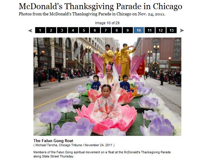 ![]() 《芝加哥论坛报》在网络上刊登法轮功学员花车的图片 |