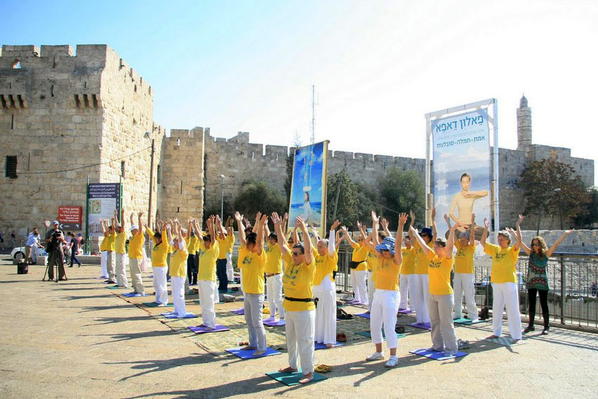 十月二十八日,古城耶路撒冷风和日丽、秋高气爽,在伽法门外,随着优美祥和的法轮功炼功音乐,身着黄色衬衫的法轮功学员演示着五套功法,一批又一批的游客驻足观看、拍照。解说员以英语、希伯来语、俄语告诉人们大法的美好和弘传世界的盛况,明白真相的游人纷纷走到征签簿前,签名支持法轮功反迫害。