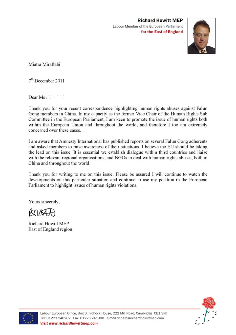 欧洲议会议员理查德·浩威特(Richard Howitt MEP)写道:“谢谢你最近为在中国发生的法轮功学员的人权遭受侵犯事件而给我写信。作为欧洲议会人权委员会前副主席,我致力推动不仅在欧盟而且在全世界的人权议题,因此,我对法轮功学员人权遭侵犯的案子非常关注。”