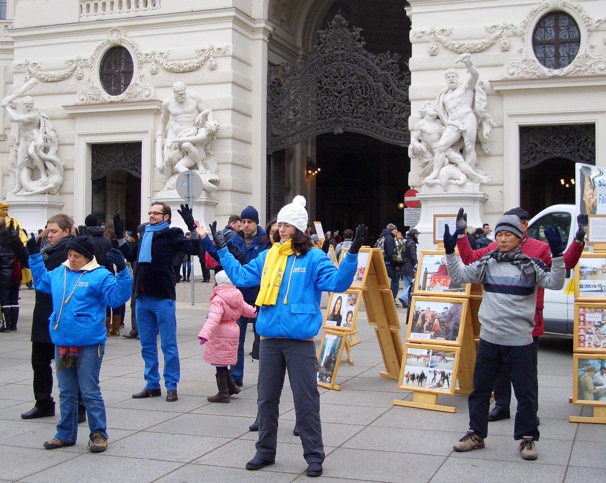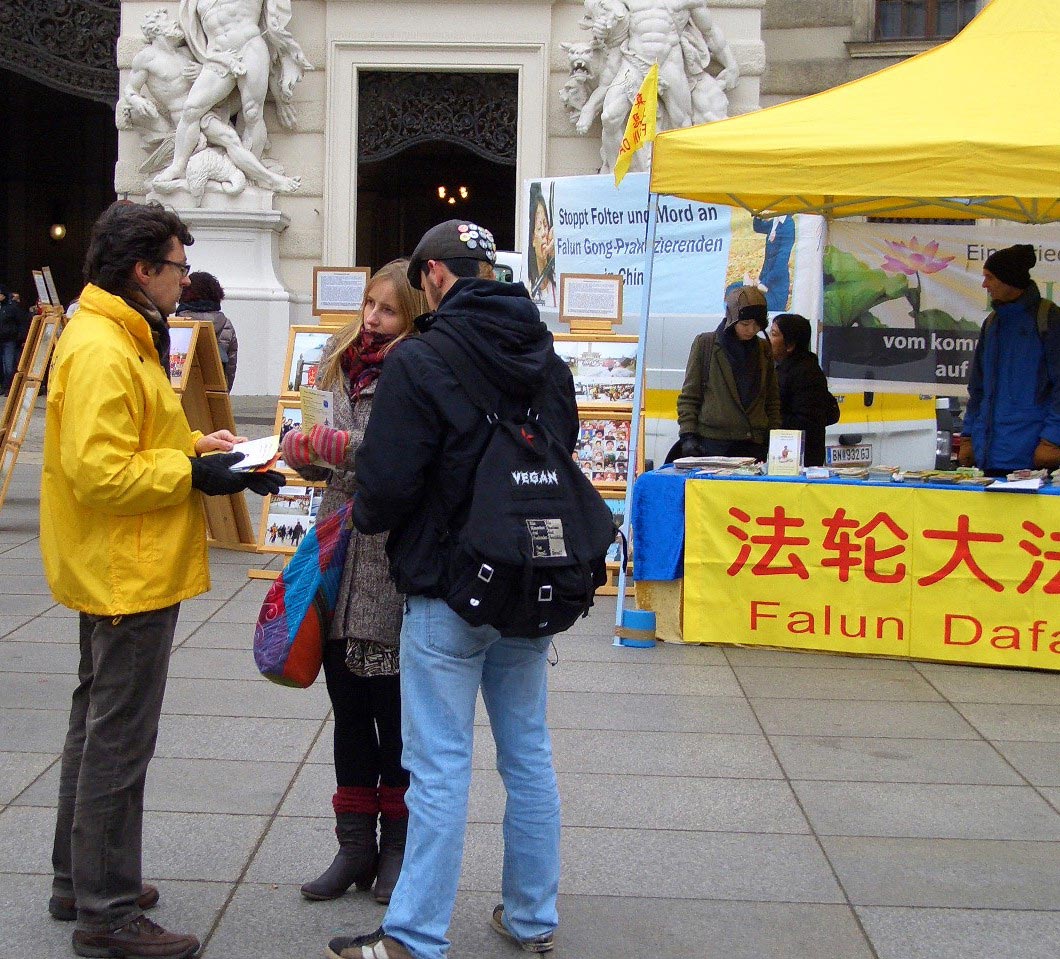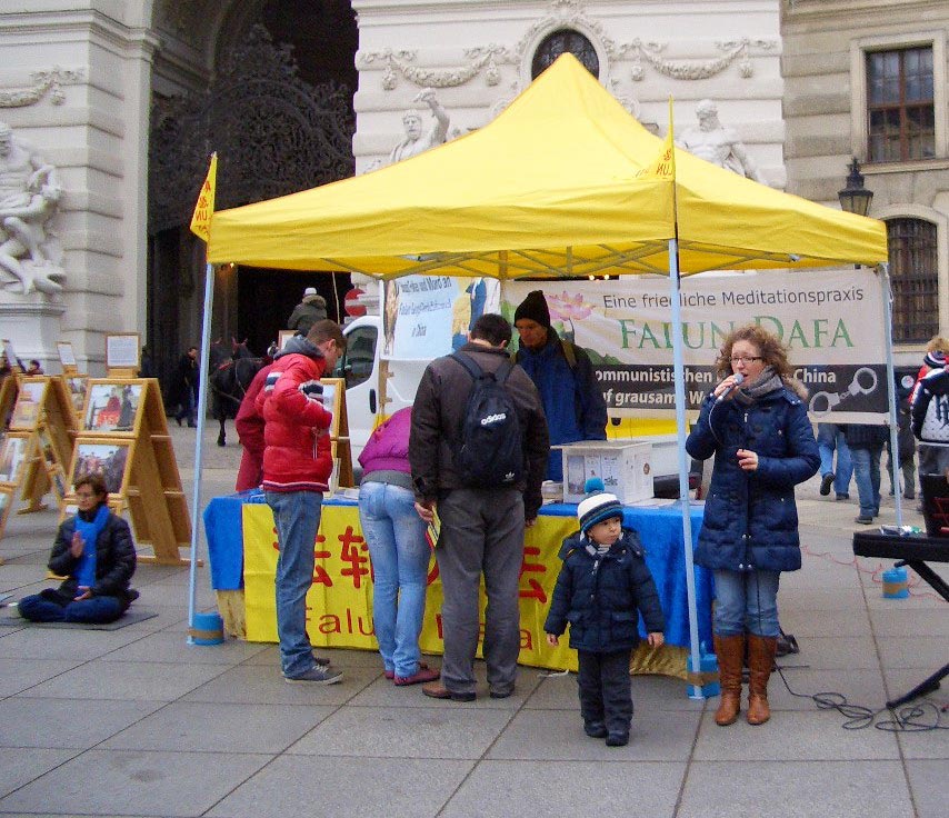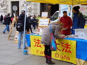 法轮功学员祥和的功法表演和学员自组的乐队演唱,吸引了很多人前来了解发生在中国的对法轮功学员的迫害,人们纷纷在征签表格上签名,支持法轮功。很多坐着大巴士从匈牙利和斯洛伐克前来逛圣诞市场的游客,在导游的带领下来到信息台前,了解了真相。