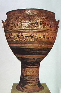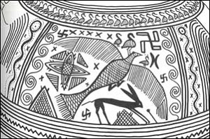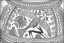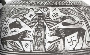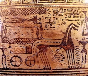 ![]() 锡拉岛双耳瓮 | ![]() 三个卍字符明显的出现在灵车和死者的前方,似乎有引路的涵意 |
