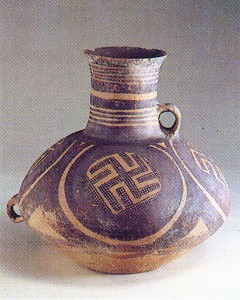 ![]() 新石器时代马家窑彩陶上的卍字符 | ![]() 马厂类型陶壶,1974年民和县官户台出土,距今6300年前后 |