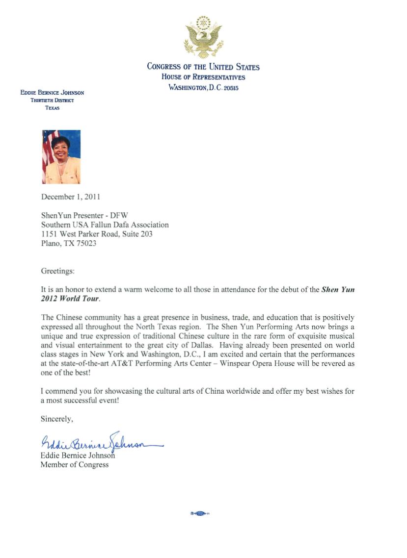 其中,国会议员艾迪•伯尼斯•庄臣(Eddie Bernice Johnson)在褒奖状中说:“神韵艺术团以罕见和绝妙的音乐和视觉艺术形式,给达拉斯带来了真正的传统中国文化。鉴于其在纽约和华盛顿DC的成功演出,我确信在达拉斯最高级的AT&T表演艺术中心的表演也将会是最美好的演出之一。”