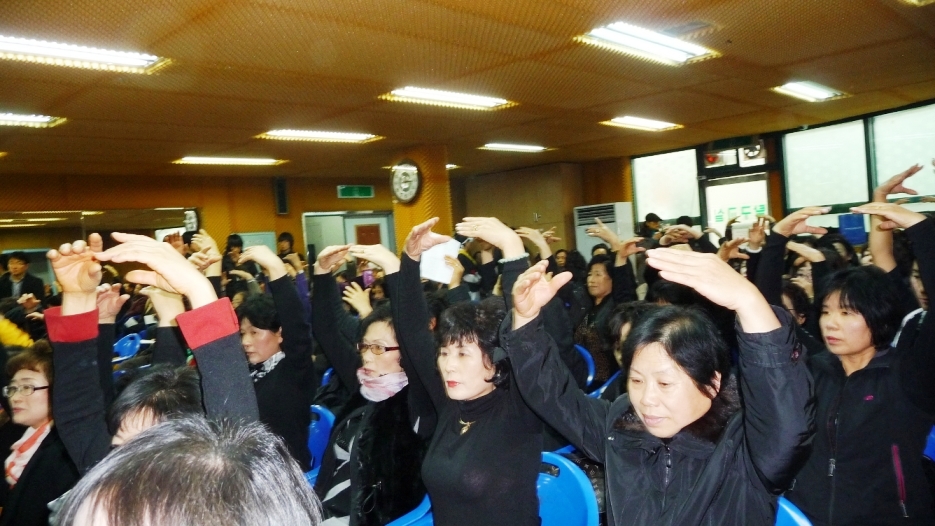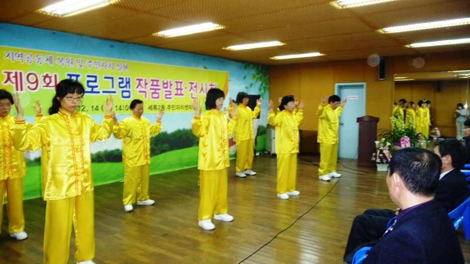 与其他团体上场表演时下面观众嘈杂的场面相比,法轮功团体上场时,场面瞬间就鸦雀无声,开始人们都静静地看着法轮功学员演示功法,随后全场人都跟着一起学炼动作,很多人纷纷接法轮功传单,当天弘法效果非常好。