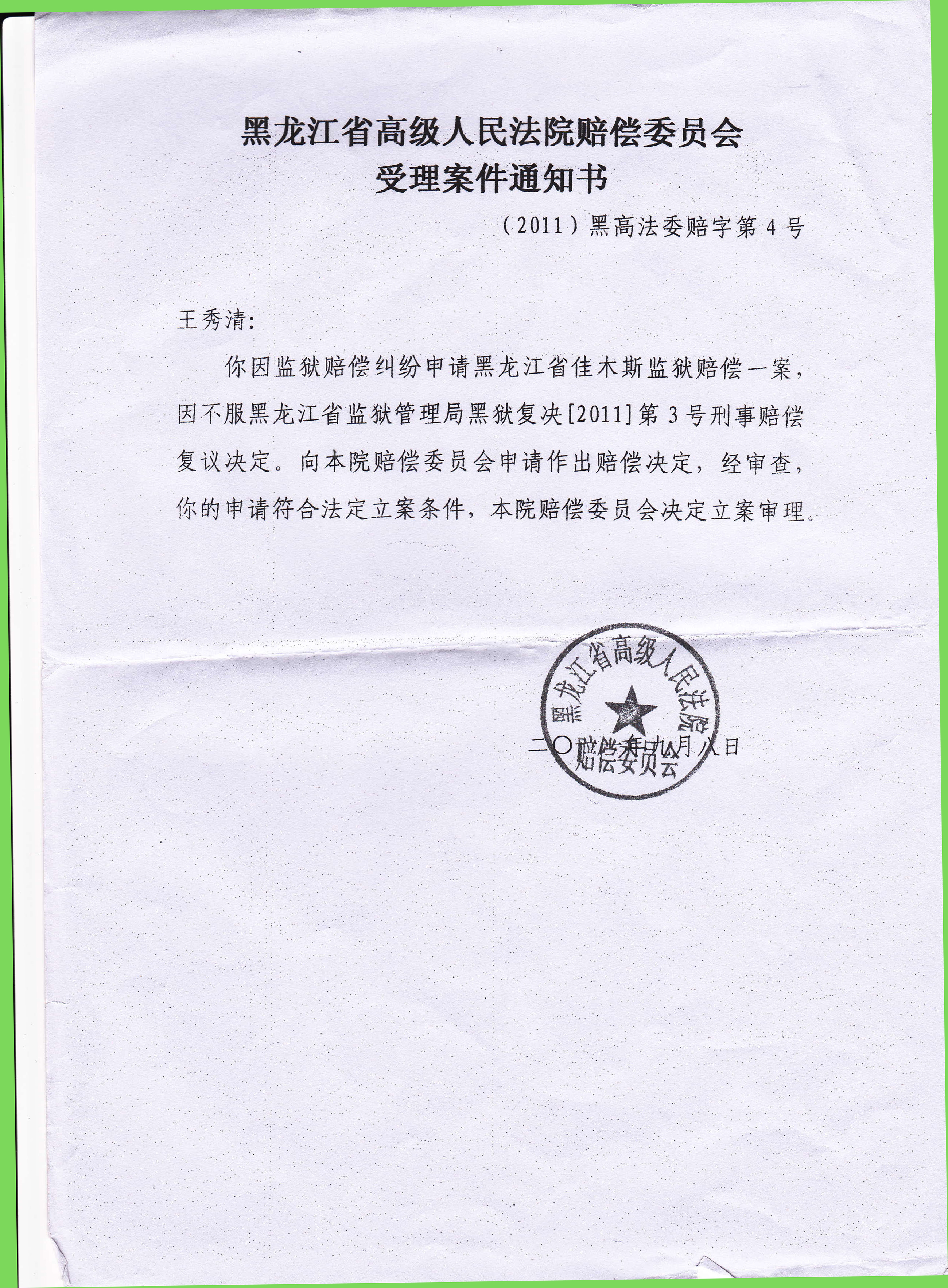 黑省高法立案通知书