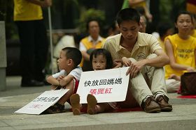 ![]() 数年前,邝森洽带同两名小儿女参与活动,营救在大陆因修炼法轮功被非法判刑三年的妻子张丽红。 |