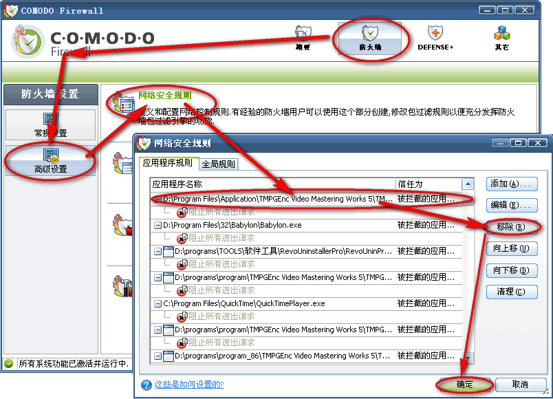 答:如果确定是因误操作导致被防火墙阻拦的安全的网络相关程序,可以这样取消 拦截:打开comodo的界面—-->防火墙—-->网络安 全规则—-->在里面找到并选中被你误 阻止的程序,移除该项目即可,或者点击“编辑”把“拦截”修改为“允许”。