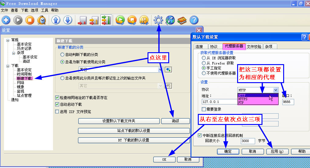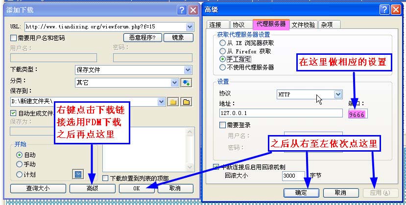 简单的文字描述,就是 fdm——选项——下载——新建下载——高级——代理服务器——把 HTTP、HTTPS、FTP端口的8580改为9666——确定——ok即可。参考下 图: