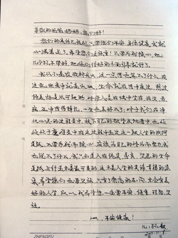 二零一一年十二月三日,孙毅家人接到孙毅从绵阳看守所寄来的两封家信。前一封信是十一月八日写的,信中没有诉说自己几个月被非法关押迫害的情景,全是对父的安慰和鼓励,透露着修炼人的平和理性,对真善忍信仰的坚定。后一封信是十一月十六日写的, 孙毅在这封信里告诉父母,当天接到绵阳涪城区法院的传票,要在二零一一年十一月二十八日九点三十分在绵阳涪城区法院对非法开庭。
