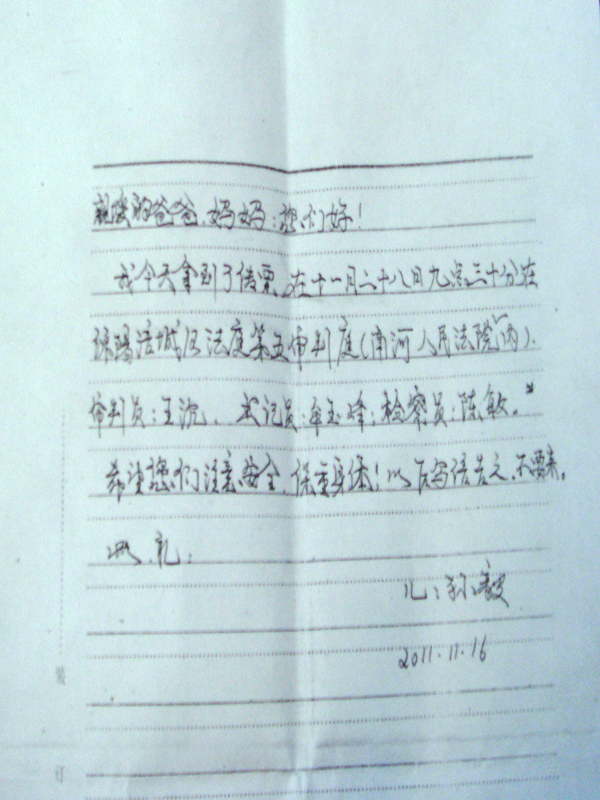非法开庭的日期是十一月二十八日, 孙毅的信是十一月十六日写的,可是家人十二月三日才收到孙毅的信。家人到目前为止没有接到来自法院的任何通知,对于庭审情况一无所知,朴实忠厚的孙毅父母一筹莫展,心急如焚。