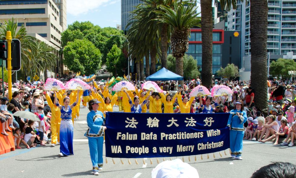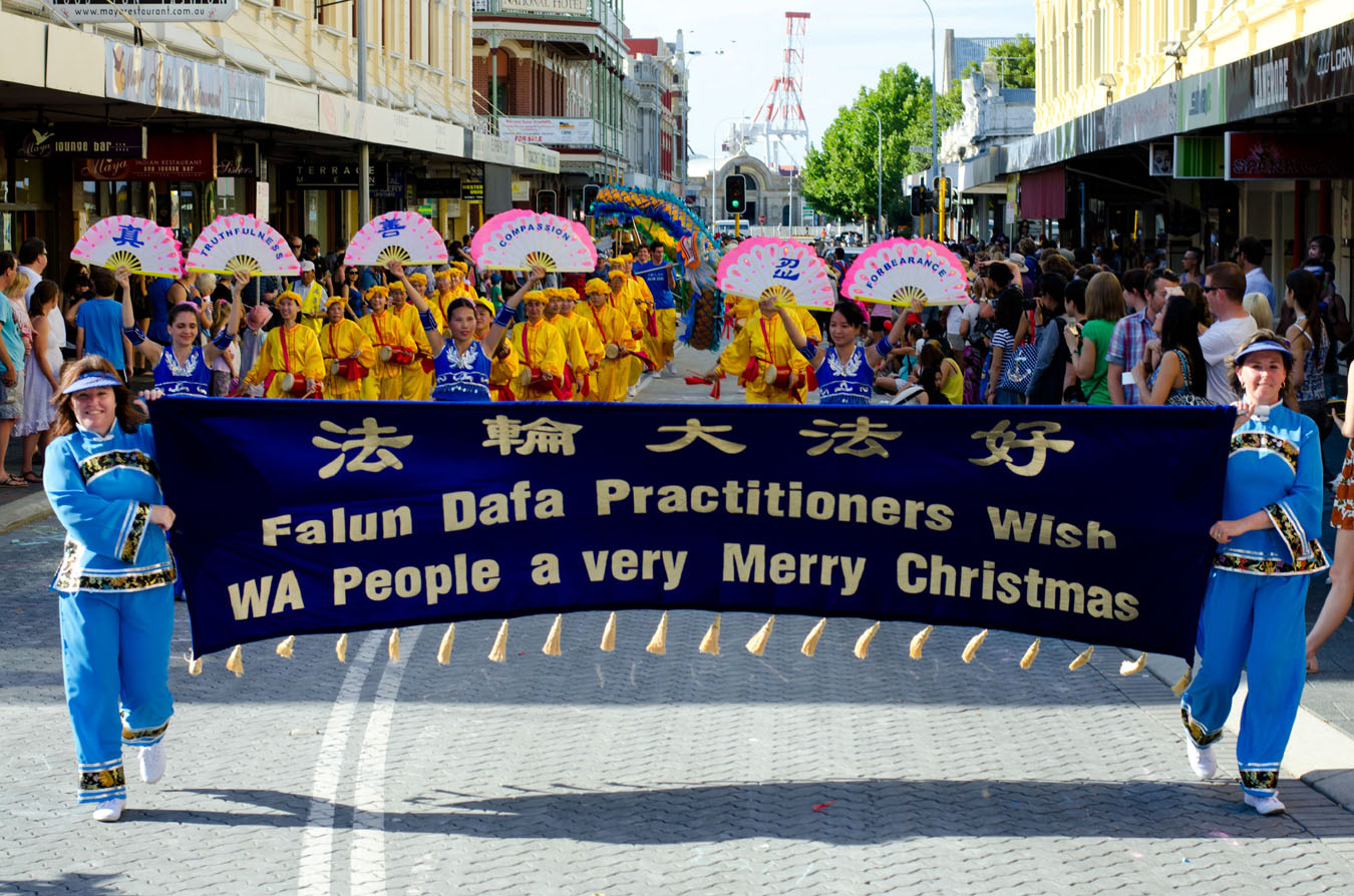 上午的珀斯圣诞游行队伍是绕天鹅河畔的兰利公园(Langley Park)一圈,历时约一小时。当日天气很热,气温高达38.5摄氏度,但高温没有挡住人们的热情,仍有超过十五万人到现场观看。法轮功学员的游行方队包括功法演示、舞龙和扇子舞。在游行过程中,主持方先后六次介绍法轮功功法和法轮功学员游行方队,主持人多次由衷地赞许“法轮功方队非常祥和(very peaceful),非常有精神内涵(very spiritual)”。