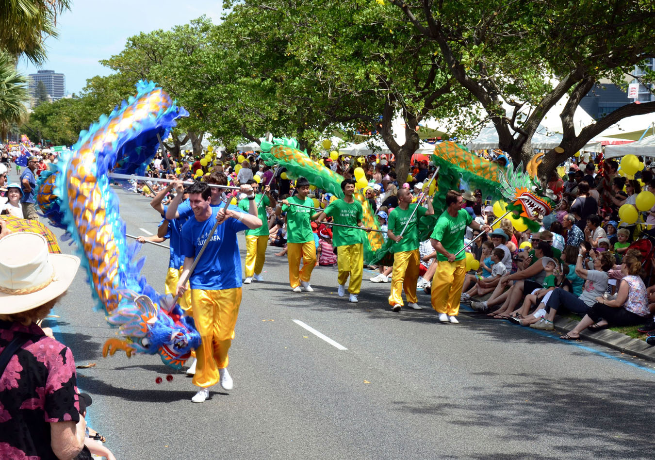 ![]() 珀斯圣诞游行中法轮功学员的游行方队包括功法演示、舞龙和扇子舞 |