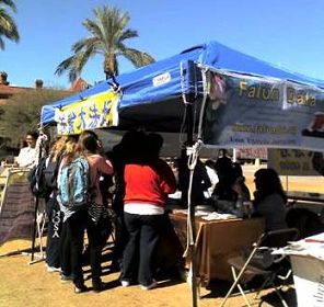 【明慧网二零一一年二月十一日】位于美国沙漠地区的亚利桑那大学,经历一周严峻寒流的侵袭,在二零一一年二月七日,终于露出灿烂的阳光。校园内学生们也活跃起来,举办社团迎新活动。法轮大法社团的学员们也在展位挂起“法轮大法好”的横幅。微风吹着横幅,路过的学生们都欣喜地诵读一遍横幅上的字。