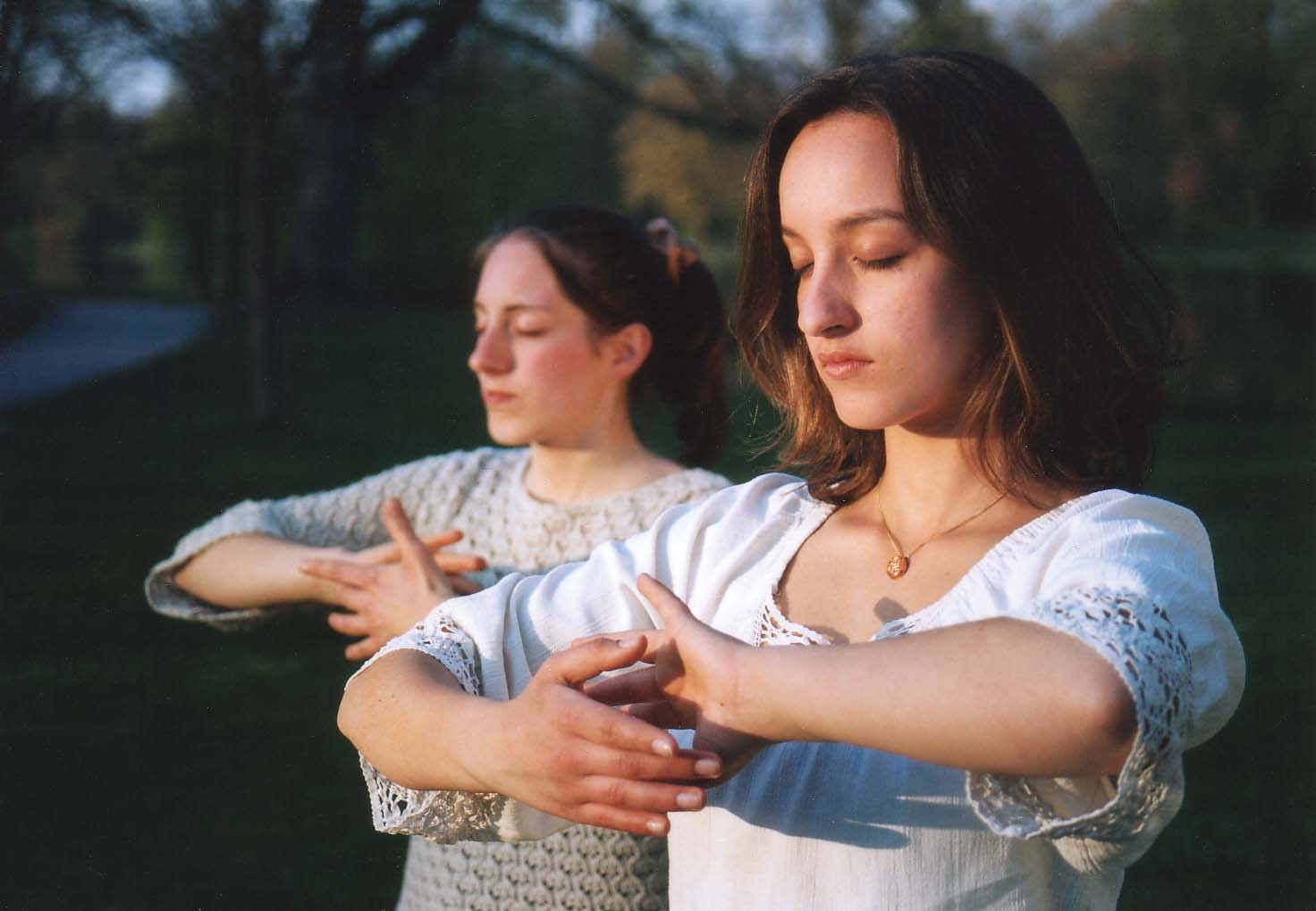 ![]() 德国法轮功学员,Koerper家庭的俩姐妹在炼功。他们全家六口人修炼法轮功 |