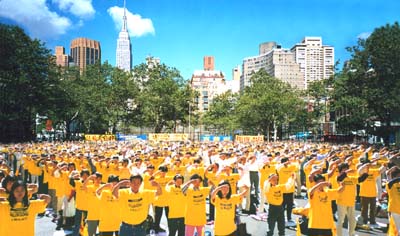![]() 在联合国千僖年高峰会议期间,来自世界各地的约2000名法轮功学员在中国驻联合国使团驻地前炼功请愿,要求停止迫害法轮功。 |