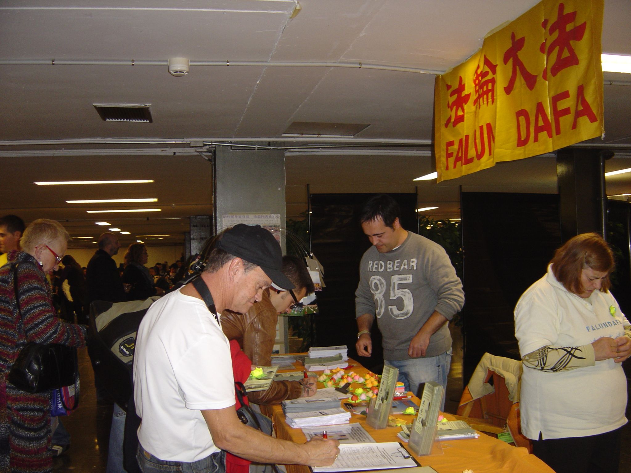 二零零六年十一月三日至五日,西班牙法轮功学员应邀参加了在巴塞罗那举办的一年一度的国际健康博览会。这项追寻精神和心灵体验者的盛会,每年吸引许多来自世界各地的参观者。法轮大法的展位上悬挂着中西文的“法轮大法真善忍”巨型横幅,电视里播放着法轮功真相节目和教功录像,《普度》与《济世》的音乐回响在展厅里。一名观众被这慈悲祥和的能量场所感动,她对学员说:“你们这里就象是另一个世界。”