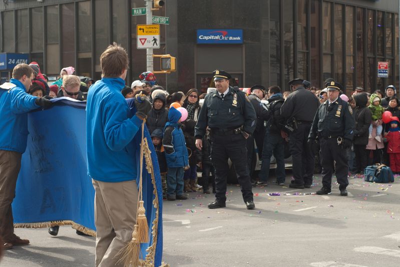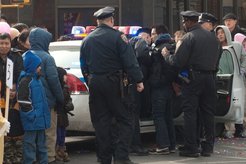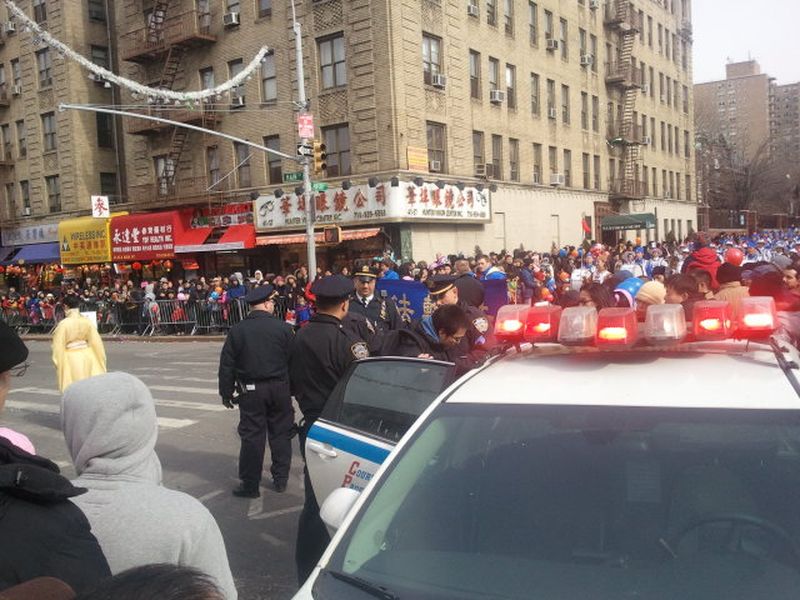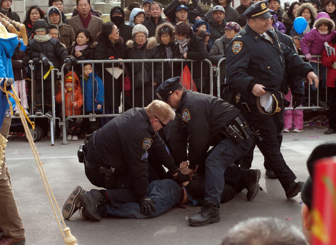 ![]() 法拉盛新年游行活动中,一华裔男子从观众群中冲到法轮功队伍的前面,拉扯横幅并折断横杆。三个警察立即冲上去将其制服并逮捕。 |