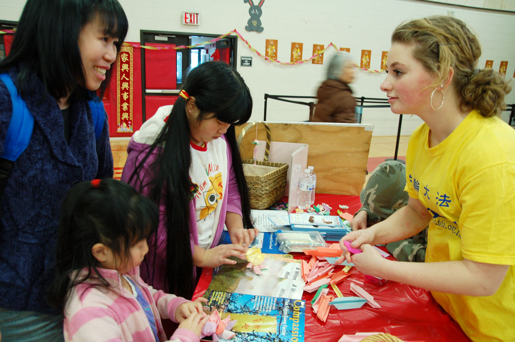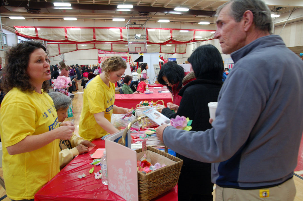 有位女士在法轮功摊位前驻足,她告诉学员知道修炼法轮大法的人都很善良,并赞叹说,“我们昨天去波士顿观看神韵晚会,真是好看啊!”