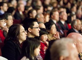![]() 二零一一年二月十一日晚,神韵纽约艺术团在麻州波士顿的首场演出,观众被传神的表演深深吸引。 |