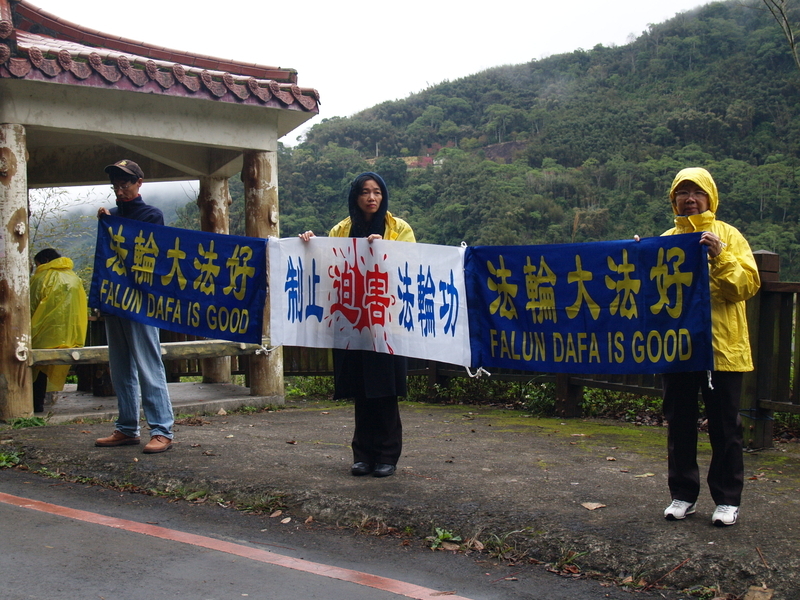 虽然新竹县天候不佳,雨势不小,却已经有不少法轮功学员冒着寒风,在通往张学良故居的县道沿路等候多时,他们举着各式大小的横幅,齐声对辽宁省车队高喊“法轮大法好”、“停止迫害法轮功”。