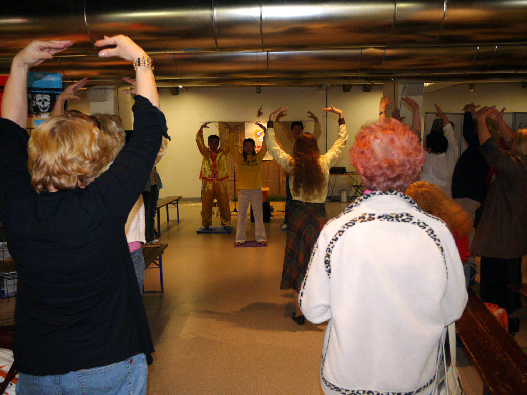 ![]() 法轮功学员的功法演示使环境变得祥和,人们兴趣盎然地当场学功。 |