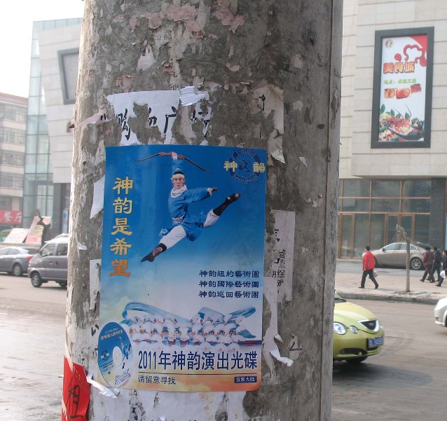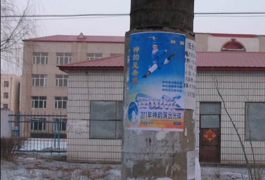 人们在自家居室的门前,在采购日常生活必需品的食杂店门口,在街头巷尾的公共线干上,在车辆行驶的公路两侧,都能看到这款以宇宙蓝为底色、图案精美的“神韵光碟海报”,海报鼓励人们去寻找2011年神韵演出光碟(光碟的传播仅限于中国大陆)。