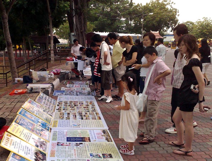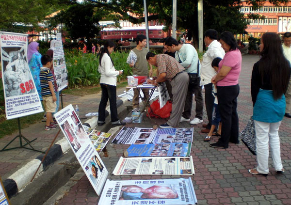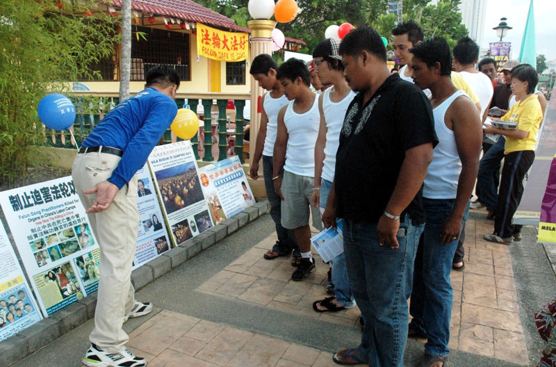 一九九九年七月二十日,中共发动了对法轮功的残酷迫害,十多年来,经核实被迫害致死的法轮功学员已超过三千四百人。这场迫害不仅针对法轮功学员的“真善忍”信仰,也针对所有人的道德原则和精神价值进行摧毁。马来西亚法轮功学员与世界各国学员一样,利用机缘,持续不断、大面积地讲清真相,呼吁民众共同制止迫害。每年汇集众多游客的龙舟赛,也是向马六甲民众讲真相的好机会。