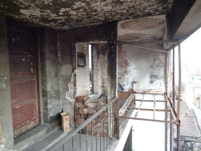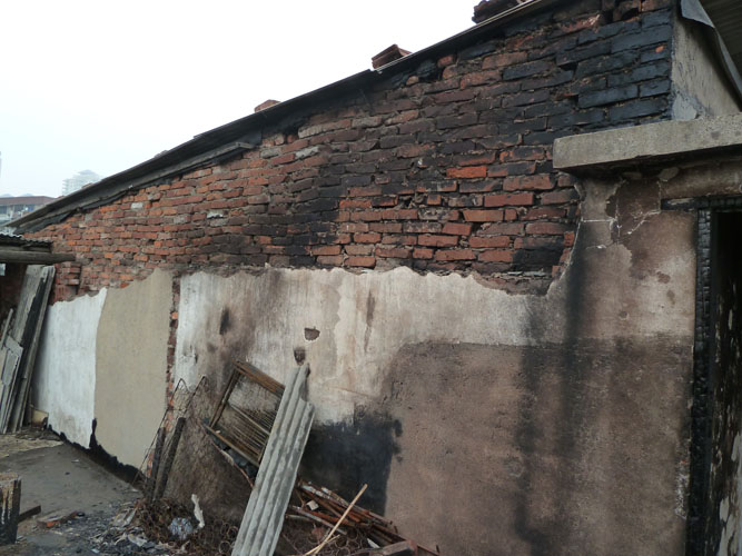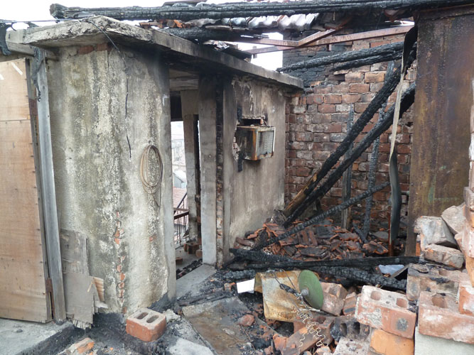 ![]() 紧邻房东简易房房顶烧毁的几根梁柱残骸 |
