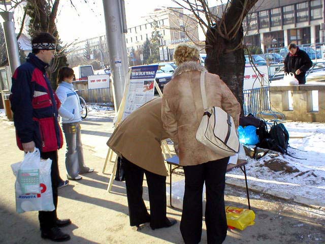 ![]() 二零零六年七月十五日,斯洛伐克法轮功学员揭露中共活摘法轮功学员器官的罪行,呼吁公众关注。斯洛伐克电视台记者到现场访问学员,该报导在全国性的晚间新闻中播出。 |