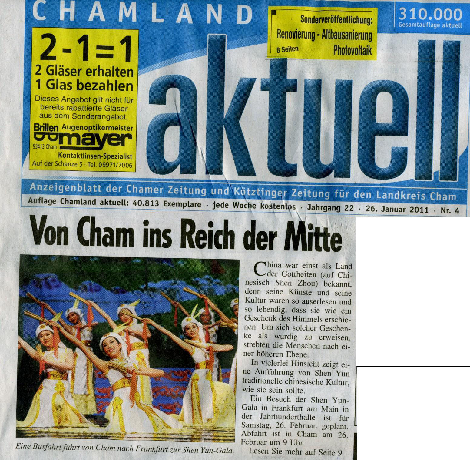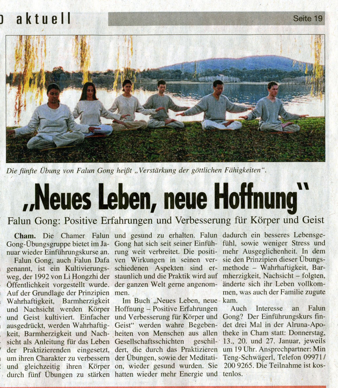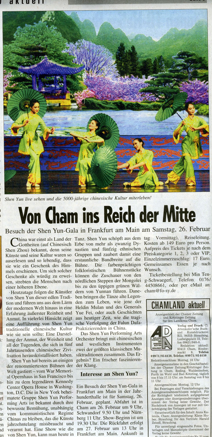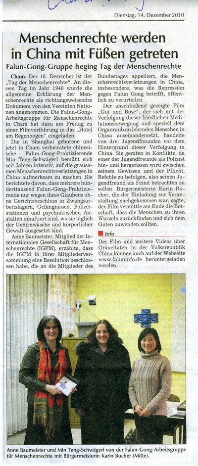 【明慧网二零一一年二月七日】卡姆(Cham)是德国南部巴伐利亚森林的东门,当地人很朴实。卡姆的法轮功学员经常拜访去当地报社,。报社记者听闻了中国大陆法轮功学员被中共活摘器官消息时,不禁流泪。明白真相的报社也努力传播法轮功真相。近期当地的法轮功学员办了一系列的活动,包括世界人权日放映电影《善与恶》;揭露中共对法轮功的残酷;开设免费教功班;组织观看神韵文化行。报纸都做了醒目的图文报导,吸引了很多有缘人。