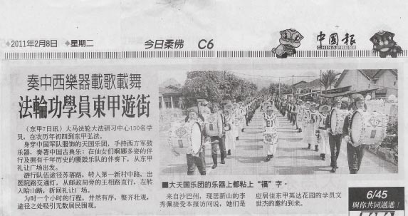 今年法轮功团体的游行队伍阵容壮观华丽优美、内容丰富,为当地民众带来欢喜的新年气氛,也震撼了民心。在东甲游行时,一名当地华文报《中国报》摄影师闻讯赶来拍了很多的相片,并召记者前来采访,在两天后刊登这则新闻。