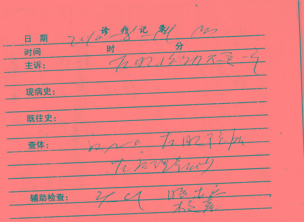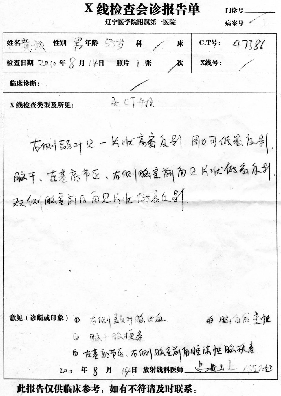 在盘锦监狱一监区一年多的时间里,黄成被迫害成出现脑梗塞和脑出血、脑白质变性、生活不能自理、心律不齐等症状。最后经省级医院检查,判定黄成随时都有失去生命的可能。以下为门诊病历、诊疗记录、X线检查会诊报告单。注:病历及化验单姓名一栏填写有误“黄诚”应是“黄成”。