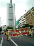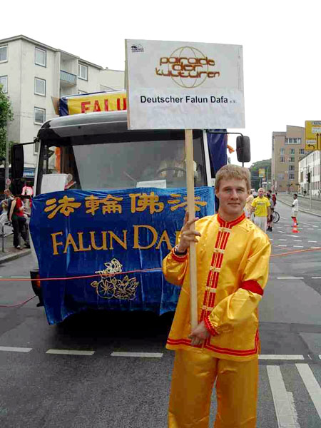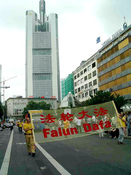 二零零三年六月二十八日,法轮功学员参加了法兰克福首届国际文化节游行,赢来市民的阵阵掌声,令路边观看的中国人感到震惊,因为眼前的情景和中共对法轮功学员的残酷迫害以及它向全世界散布的谎言有着巨大的反差。