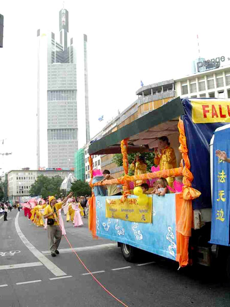 在二零零四年六月二十六日举办的第二届法兰克福多元文化节上,沿途成千上万人驻足观看。法轮功的游行队伍从一百多个团体中脱颖而出,得到大会主席团的好评并得到了第二名大奖。