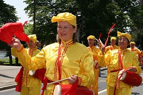 在参加文化节游行约六十个团体中,以“中国的文化与修炼”为主题的法轮功修炼者引人注目。几位穿着金黄色中国传统服装的法轮功学员在一辆装饰着中国风景画的彩车上展示功法。美妙的音乐响起,女学员们随之翩翩起舞,一切都是那么和谐。她们身着传统的中国服装,表演几千年来在中国深受喜爱的民间节日庆典舞蹈──扇子舞,姿态各异、美不胜收。另一组法轮功学员身穿金黄色传统服装一路表演功法,向人们展示修炼的功法。
