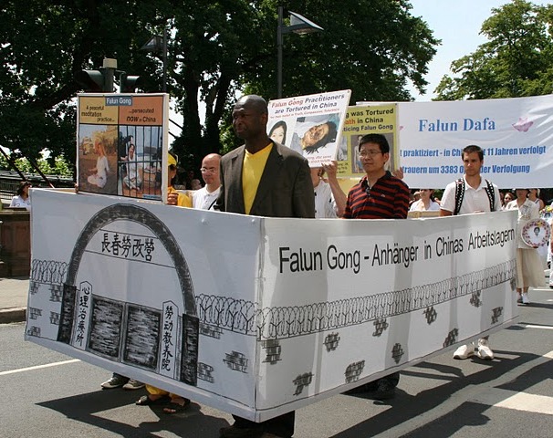 在二零一零年六月二十六日第八届法兰克福文化节上,除了腰鼓阵、扇子舞和莲花舞以及花车上演示法轮功功法之外,还专设一个方阵,揭示在中国监狱劳教所中法轮功学员所遭受的酷刑迫害,一组身着白衣的女学员,手捧被中共迫害致死法轮功学员照片,缓缓而行。