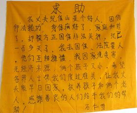 由于中共恶徒相互推诿不放人,逼得纪保山的妻子只好抱着两个月的孩子沿街乞讨,把丈夫因炼法轮功做好人、被方正县国保大队绑架抄家、造成妻子和两个孩子无法生活、没有经济来源的处境和目前的悲惨遭遇,写在一块黄布上,呼吁各界善良的人们给予关注。