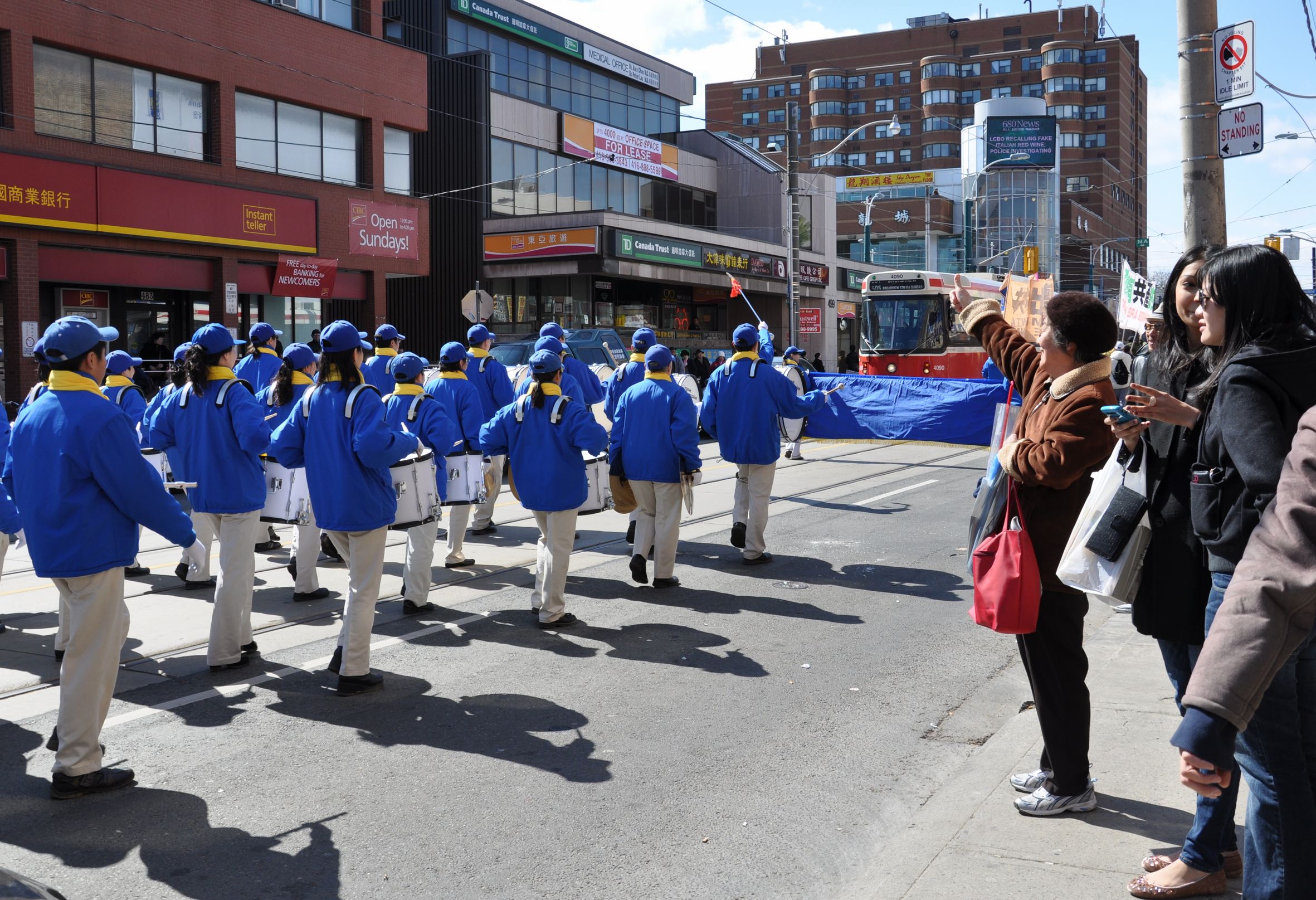 多伦多市民曾女士高举双手冲着游行队伍大声鼓掌,并竖起大拇指赞叹。