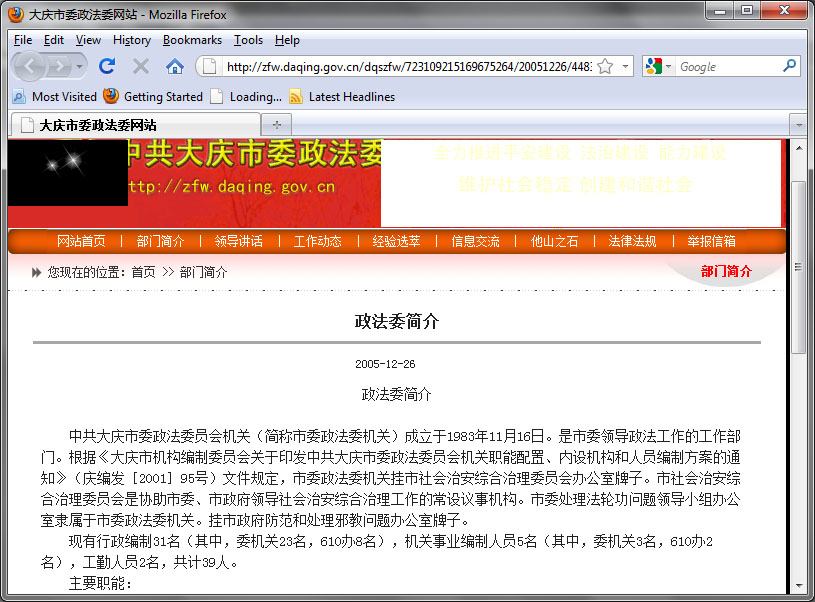 黑龙江省大庆市政法委网站对大庆市政法委的简介(网络截图)