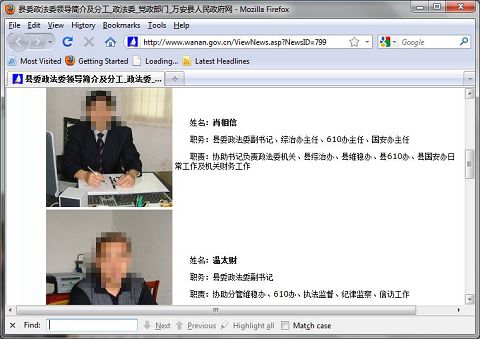 江西省万安县县委政法委的网站上列出了政法委的分工,其中政法委副书记兼任六一零办主任(网络截图)
