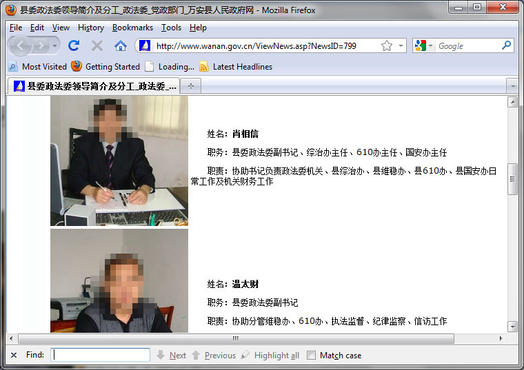 江西省万安县县委政法委的网站上列出了政法委的分工,其中政法委副书记兼任六一零办主任(见下图)。