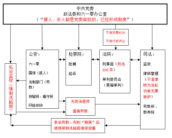 中共政法系统迫害法轮功示意图:“讲政治不讲法律”的公检法司是中共的迫害工具