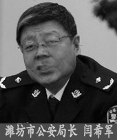 闫希军,男,二零一零年十二月任潍坊市公安局局长,之前为山东省公安厅治安总队政委。