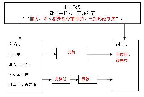 ![]() 中共用非法的劳教迫害法轮功示意图:政法委、六一零通过公安任意抓人(主要是国保)、劳教(公安法制部门),绕过司法程序可以把人非法关押四年之久。非法的劳教制度为中共迫害法轮功提供极大方便,从而成为中共大规模非法关押、酷刑折磨法轮功学员的主要形式。这是在迫害法轮功中,公安权力急剧膨胀和败坏的重要原因。 |