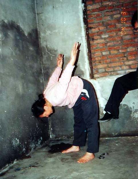 ![]() 酷刑演示:“开飞机” 腿与身体呈直角,双手高举,使被迫害者苦不堪言, | ![]() 酷刑演示:吊铐 |