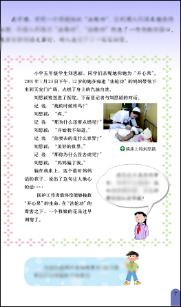 在第7页,教材灌输道:小学五年级的学生刘思影,在2001年1月23日下午,在妈妈的带领下,来到天安门广场,点燃身上的汽油自焚。