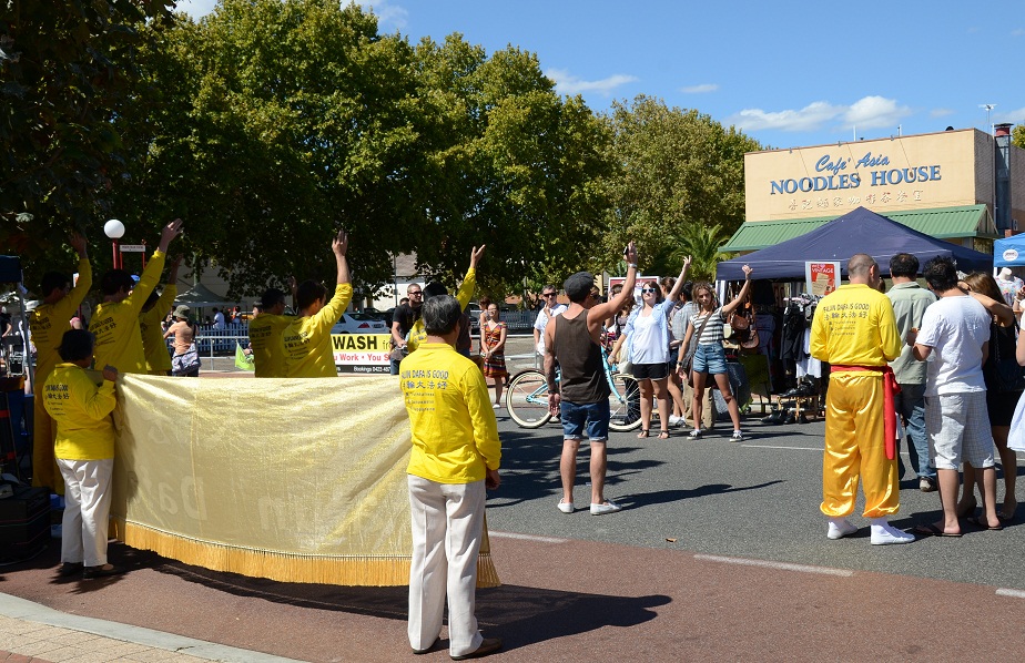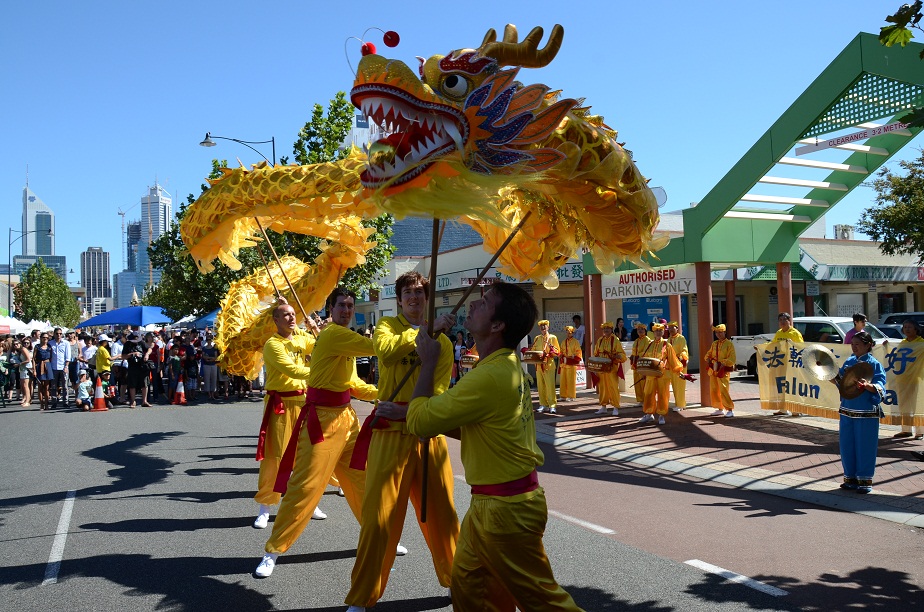 由法轮功学员组成的腰鼓队和金龙在《法轮大法好》和《喜庆》的音乐声中出现在人们眼前,将文化节的气氛推向高潮。人们纷纷拿起相机拍照留念,并饶有兴致地观看表演。表演赢得了观众们的阵阵掌声。